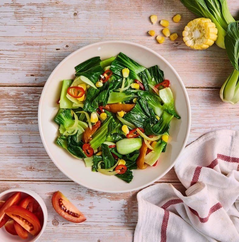 Tumis bawang putih hingga harum. Masukkan pakcoy dan jagung manis, beri sedikit garam dan gula. Masak sebentar hingga sayur tetap segar.