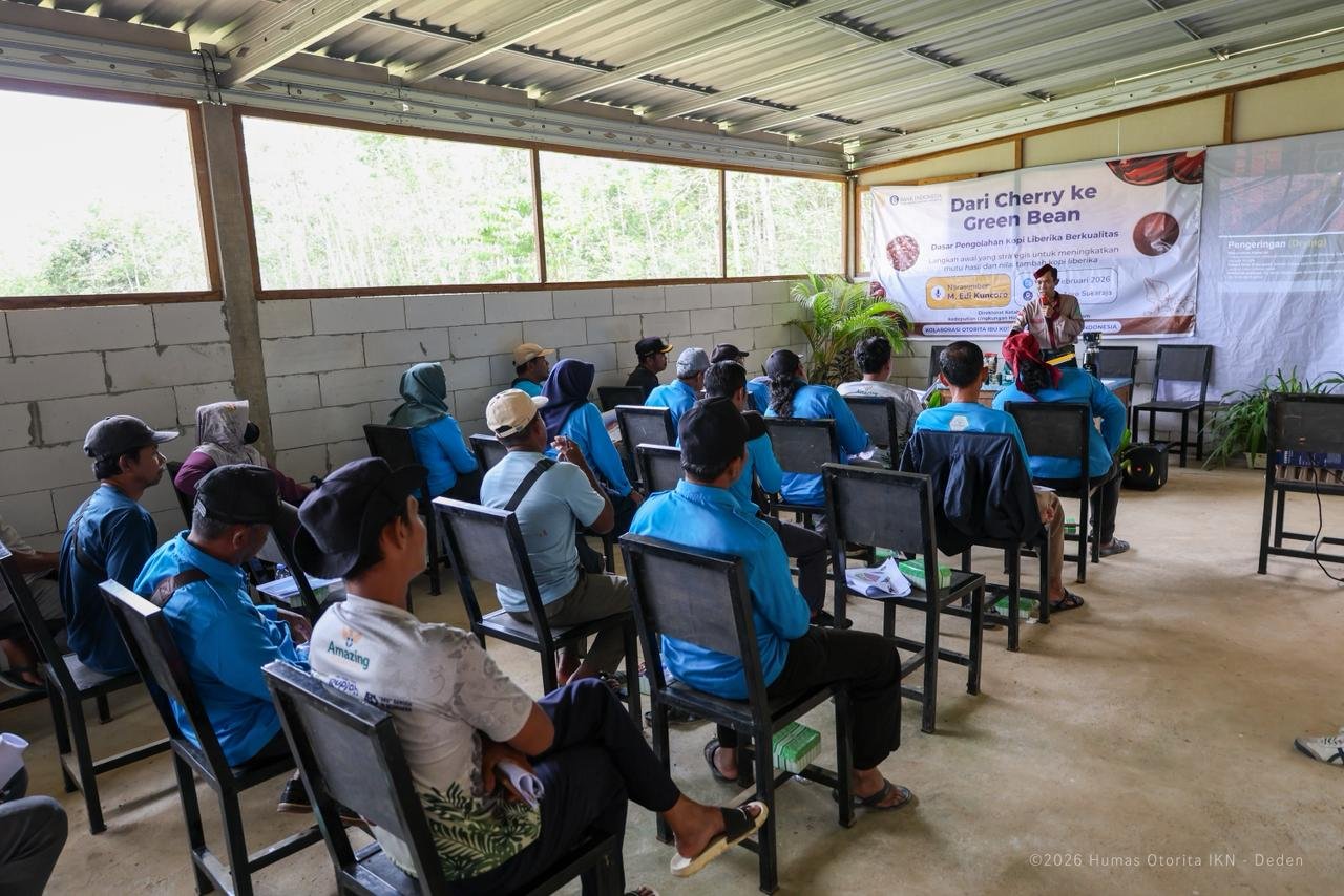 NUSANTARA, Headlinews.id – Otorita Ibu Kota Nusantara (IKN) menjalin kerja sama dengan Sekretariat Kerja Kantor Bersama Bank Indonesia dalam penyelenggaraan pelatihan peningkatan kapasitas petani kopi liberika di kawasan Agro Wisata Sukaraja, Senin (2/2/2026). Kegiatan ini menjadi bagian dari upaya mendorong penguatan ekonomi lokal melalui peningkatan kualitas dan daya saing komoditas unggulan masyarakat di wilayah penyangga IKN.