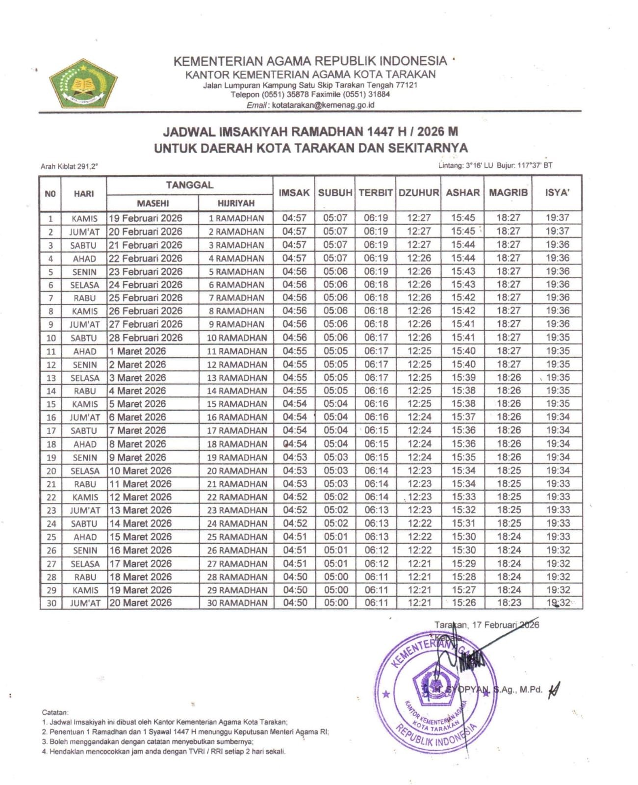 Dengan terbitnya jadwal imsakiyah ini, umat Islam di Kota Tarakan diharapkan dapat menjalankan ibadah puasa secara tertib dan tepat waktu, serta memaksimalkan amalan selama bulan suci Ramadhan 1447 Hijriah. (saf)